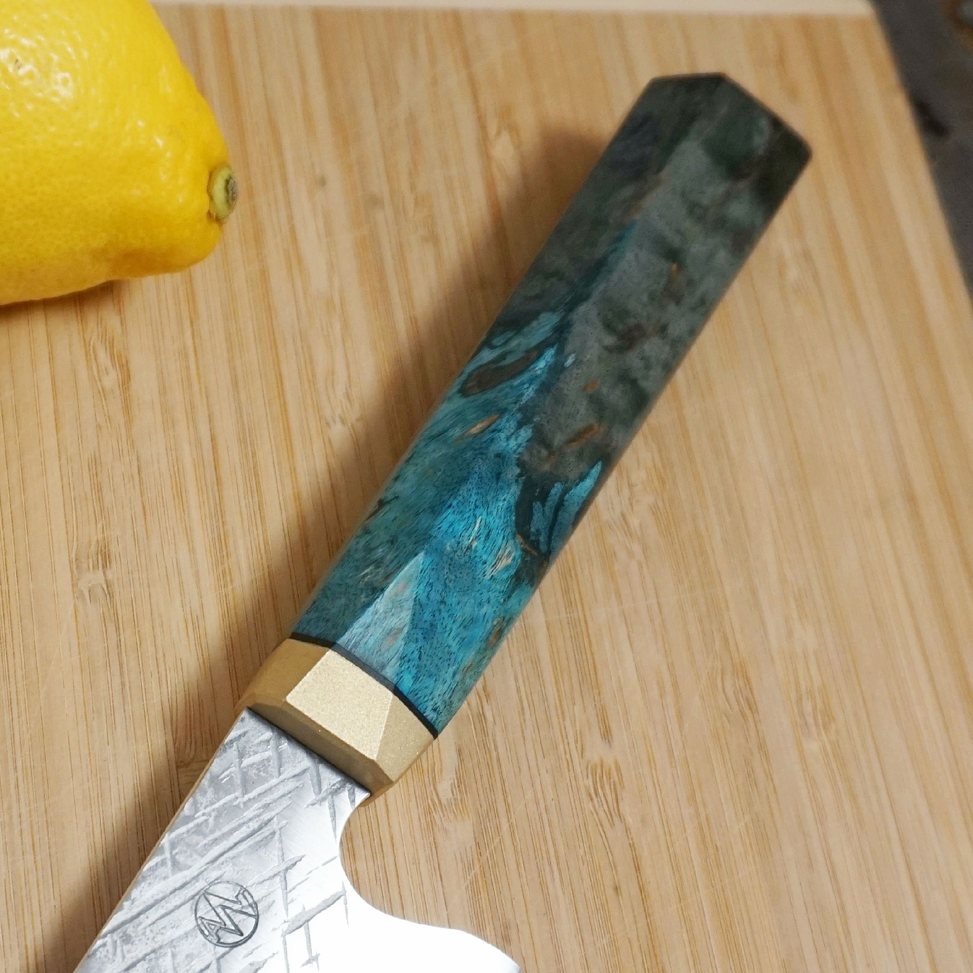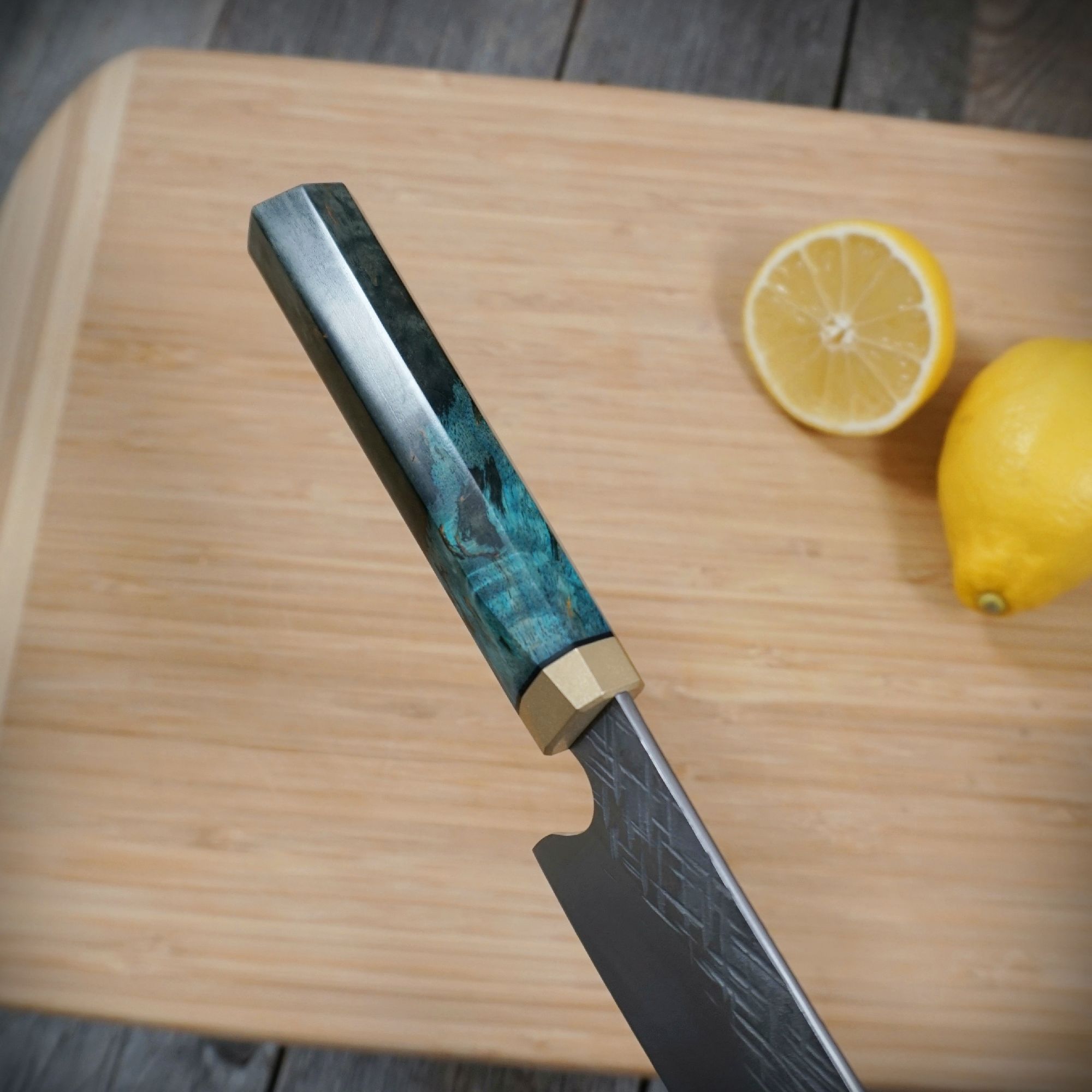 - Griff aus Messing und blau/schwarz stabilisierter Karelischer Maserbirke