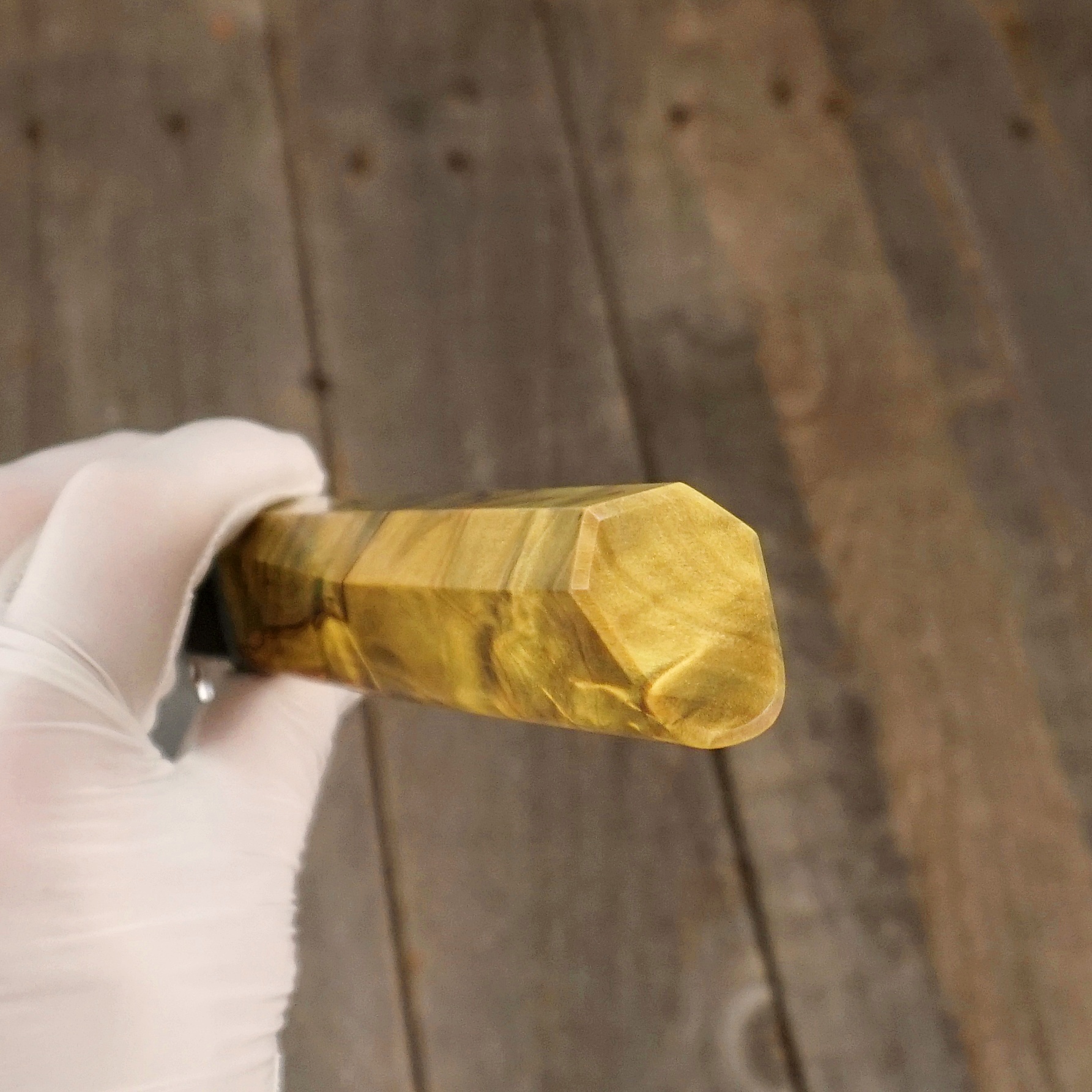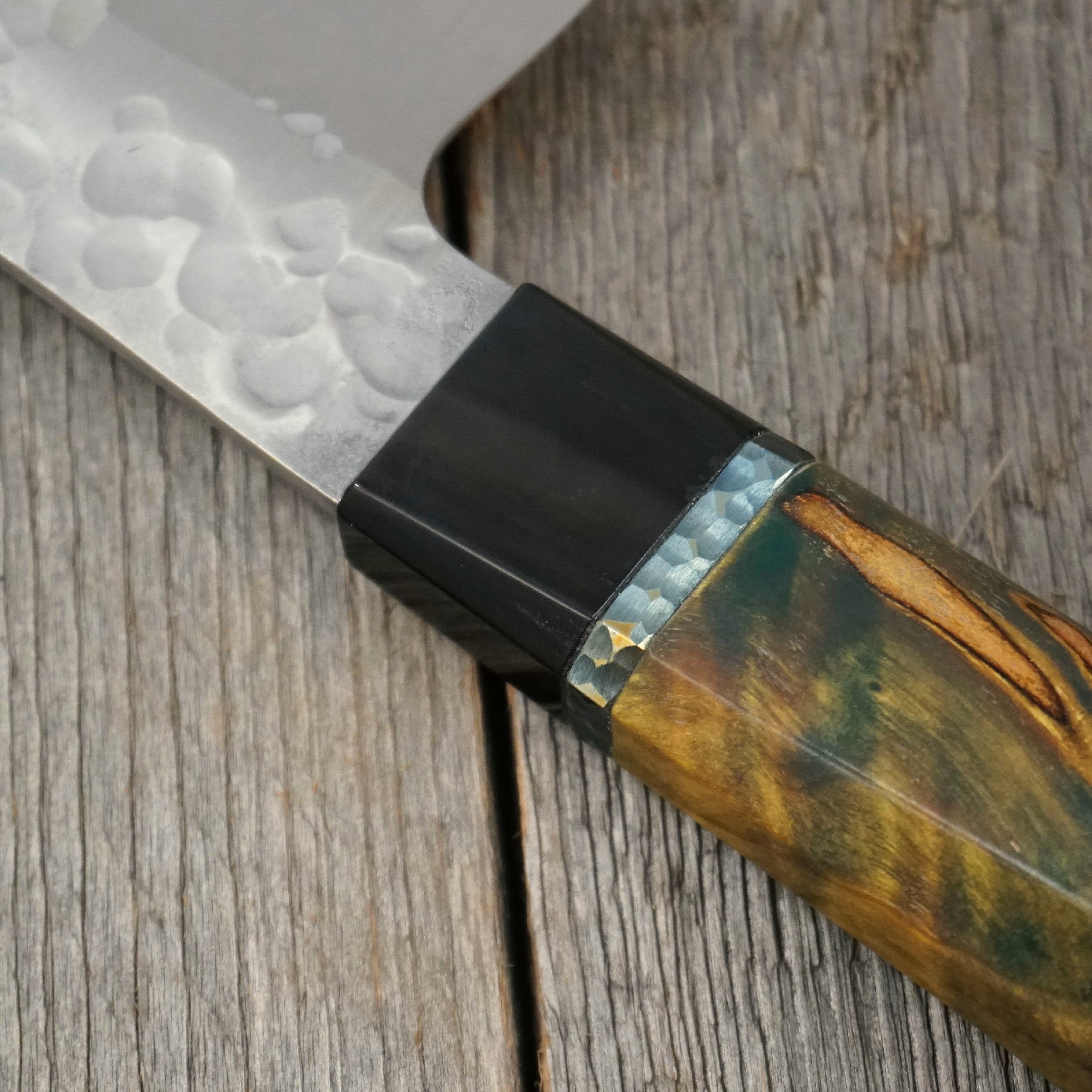 - Griff aus schwarzem Büffelhorn, strukturiertem Titan und gelb/gold stabilisiertem Pappelmaser-Holz